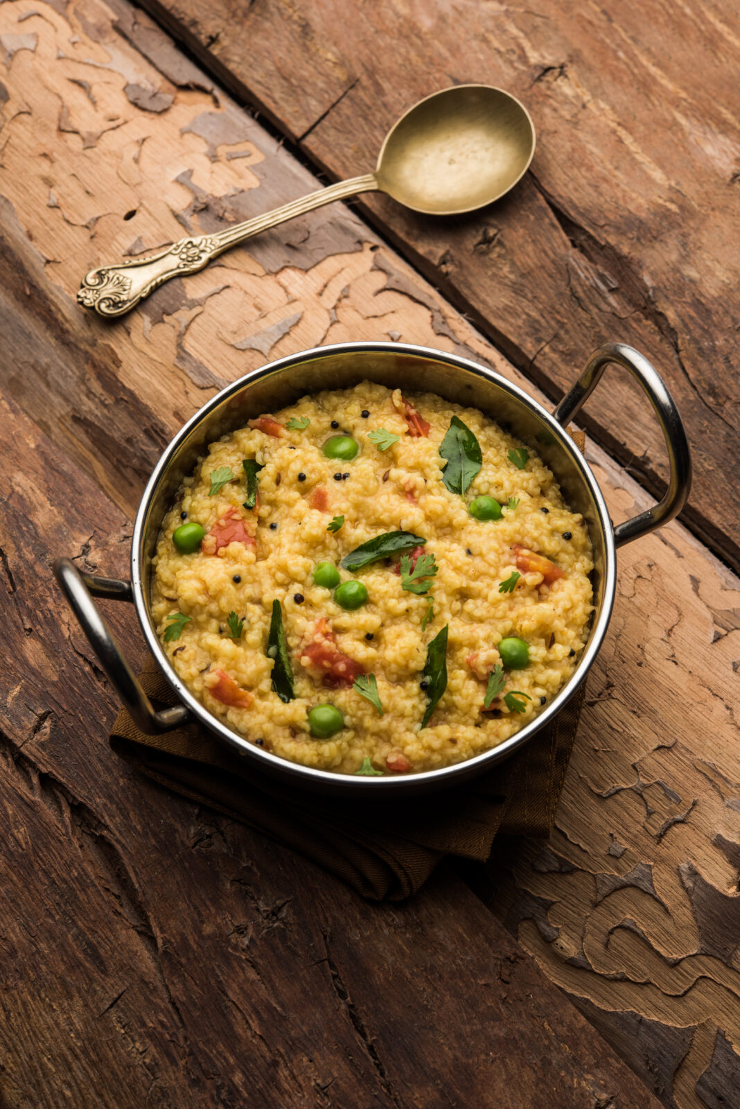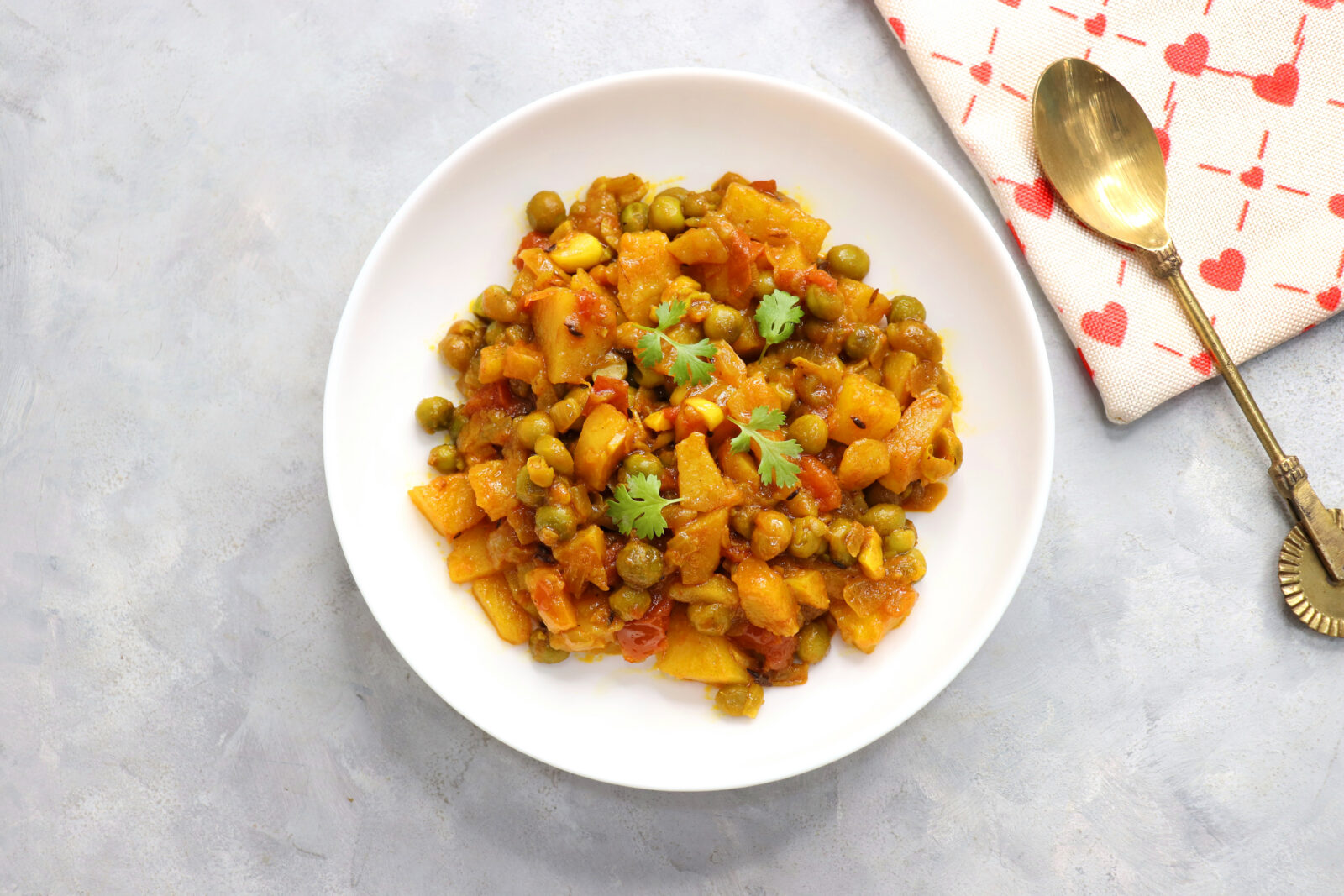 Potatoes, Tomatoes, and Peas is a versatile dairy-free “gravy” that can be served over khichdi. Add your favorite vegetables to it.