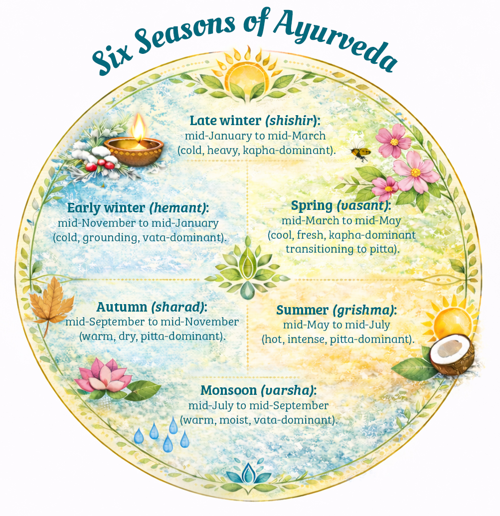 Late winter (shishir): mid-January to mid-March (cold, heavy, Kapha-dominant).Spring (vasant): mid-March to mid-May (cool, fresh, Kapha-dominant transitioning to pitta).